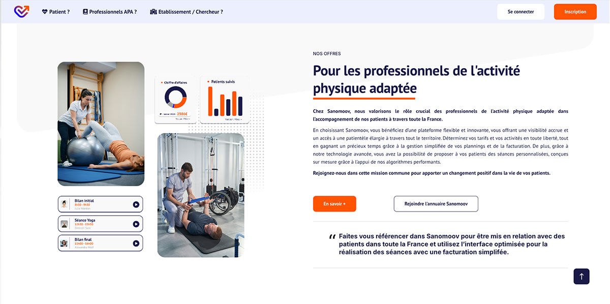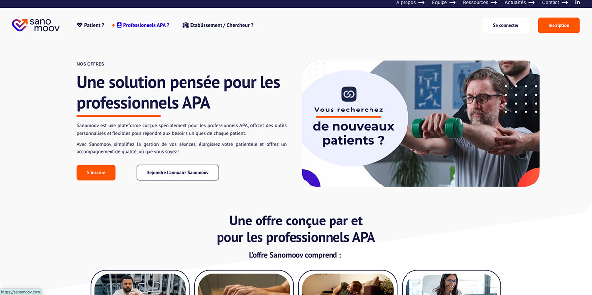 En parallèle, nous avons conçu et développé un site vitrine qui raconte simplement la proposition de valeur et ses trois portes d’entrée : patients, professionnels APA et établissements de santé. L’interface met l’accent sur la lisibilité, la crédibilité médicale avec un centre de ressources riches, et des CTA nets.